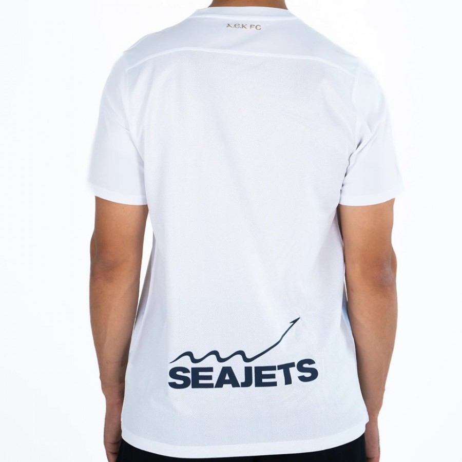 The Nike AEK 2025-2026 third shirt is based on Nike's most basic teamwear option. A white base is paired with a yellow Nike logo, with all AEK and sponsor logos applied as well.