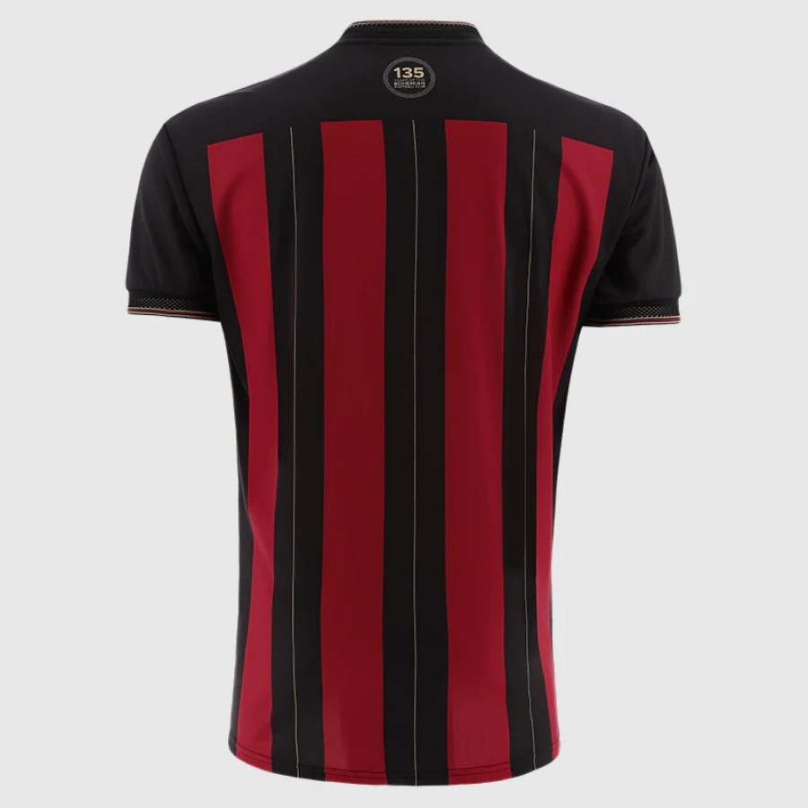 Our 2025 jersey retains the club’s famous red and black stripes but with the incision of gold trimming to mark the anniversary, sewn on gold sleeve stripes, as well as ‘135 years’ embroidery under the crest and ‘135 years’ text and knot-work design on the rear neck. Inside the neck tape has the words ‘135 Bliain’.