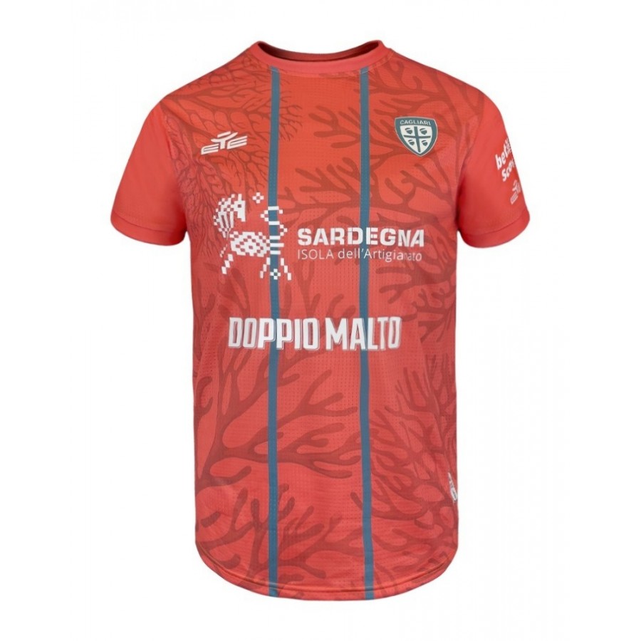 A silent power lies hidden within the ocean. It yields neither to time nor to pressure. It is still yet full of vitality, always ready to absorb impact and retaliate with equal force. Resistance is transformed into kinetic energy. This is the origin of the Gara Fourth “Reef Tide” jersey. It is made from Repreve-certified recycled yarn in Dimple polyester fabric, paired with rounded mesh sleeves. The design is inspired by Mediterranean coral and adorned with contrasting vertical stripes. This jersey perfectly blends sustainability, technical design, and professional performance, making it ideal for football and high-intensity sports. The front features the Cagliari Football Club shield logo and the EYE Sport logo, both made from the latest generation of silicone, reducing weight by over 70%. Ribbed collar and cuffs. A personalized sweatband with “Cagliari” and “EYE Sport” printed on the inside of the collar. The upper back of the jersey features Cagliari fans' iconic slogan, “Ovunque tu sarai” (Ovunque tu sarai).