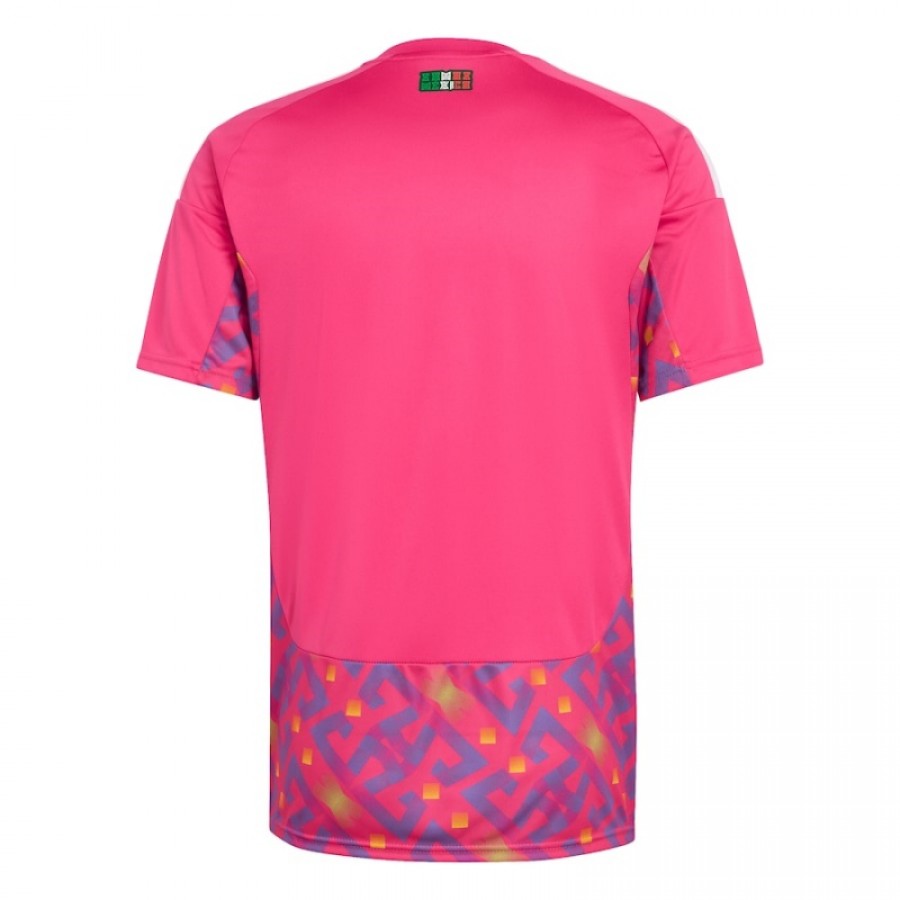 The Adidas Mexico Mens Goalkeeper Soccer Jersey 2026 features a vibrant pink base with custom purple-red geometric patterns on the torso and shorts. The design is inspired by the iconic and distinctive goalkeeper gear worn by Mexican legend Jorge Campos, reinterpreted through the Adidas 2026 streamlined template. While based on the brand's 2026 goalkeeper template, the Adidas Mexico 2026 goalkeeper jersey features a specially customized design and color scheme for the Mexican national football team.