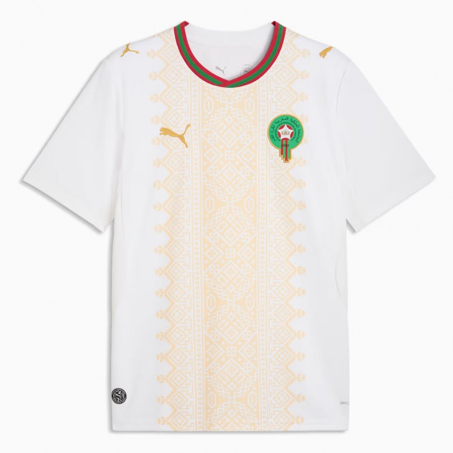 Moroccan craftsmanship ready for the world stage. The Morocco Adult Away Soccer Jersey 2026 features the same traditional embroidery seen on the home kit, but flipped into a regal white and gold colourway. This Replica jersey pairs the same match-worn look with a casual silhouette, details, and materials, ideal for both game day and everyday wear.